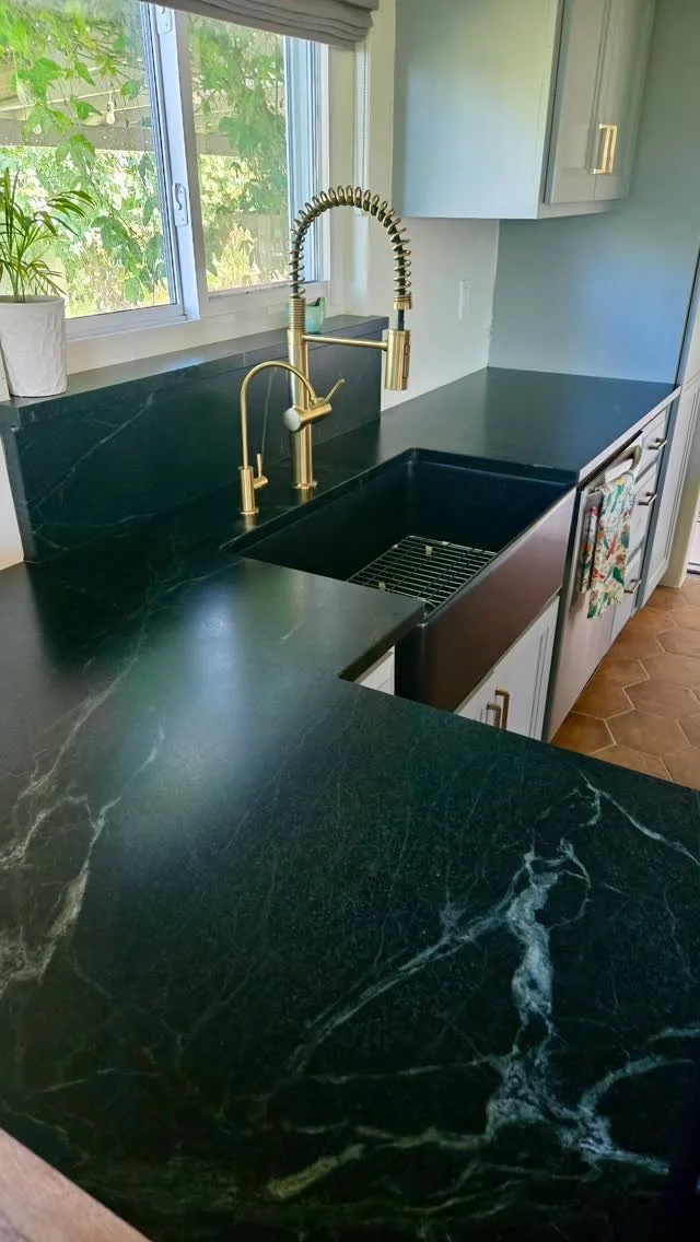 • Soapstone is a durable, non-porous natural stone that resists stains and heat. It develops a beautiful patina over time, giving your kitchen or bathroom a timeless, organic look.